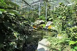 In 2010 the RSBG opened the 5,000-square-foot Rutherford Conservatory, a climate-controlled greenhouse open to the public that displays a collection of tropical rhododendrons known as vireyas. The vireya section, which has about 319 species, is found almost entirely in Indonesia, Sumatra, Borneo, the Philippine Islands, Malaysia, Thailand and New Guinea. Some of the vireyas on display in the Rutherford Conservatory are nearing extinction in their native habitat due to forest degradation. In addition, other rare plants such as wild orchid species and tree ferns are displayed, all growing together as one would see them in their native habitats that span oceans and continents. The conservatory is named for RSBG volunteer Francis C. Rutherford.[2]