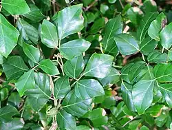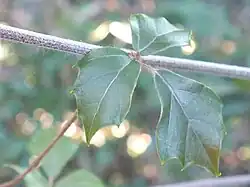 The dark green, rhombic leaves are trifoliate that comprise three asymmetrical leaflets with short stalks which are coriaceous and satiny with pale russet hairs below and with an irregularly toothed margin. Each tooth is tipped with a roughly 1 mm long point, and the leaflet tip decreases to a degree.[2]