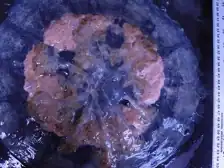 The diameter of Rhopilema verrilli ranges from 35 to 50 cm; the maximum size found is 51 cm in bell diameter. The bell is gelatinous, mushroom-shaped, and translucent. The bell ranges from a variety of colors such as white to light yellow, brown, blue, pink or green. The margins of the bell usually have a very light-brown pigmentation. Laterally, the species has a reddish-brown pigmentation from the organs underneath such as the pinkish digestive glands. The mushroom jellyfish lack tentacles; instead, they have 8 oral arms with finger-shaped appendages with nematocyst warts underneath the middle of the umbrella. The arms are brownish in color.[3] The species has 8 rhopalia, which are small pink structures located around the bell margin. Each rhopalium contains a gravity sensor, allowing the jellyfish to tell its orientation and direction. This jellyfish also has 8 radial canals. The radial canals along with the stomach form the gastroendodermal system.[7]