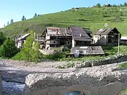 Rhuilles is a frazione of the Italian comune of Cesana Torinese (province of Turin), located at 1,675 metres above sea level in the Val Thuras (upper Val di Susa). It is a tiny Alpine hamlet (pop. 4 in 2006) with characteristic grange (ancient agricultural baite in wood and stone). An old communal stone bread oven is to be found and a seventeenth-century chapel with a well-preserved wooden altarpiece.