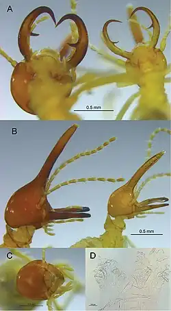 Soldiers are smaller than workers, are either monomorphic or dimorphic and the head capsule is rounded to a near pear shape. The inner margins of the mandibles are either serrated or smooth, strongly or evenly curved and the inner marginal tooth is conical. Apical extent of mandibles either weakly overlapping or evenly distanced when closed. The frontal tube about the same length of the head or longer and always covering the post-clypeus in dorsal view. Forecoxa process often pronounced and subcylindrical.[3]