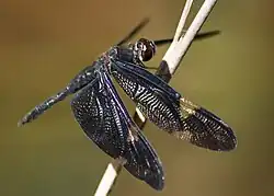Rhyothemis princeps is found in Australia and New Guinea only. It is a medium-sized dragonfly (wingspan 70mm, length 40mm) that inhabits a variety of freshwater lakes, ponds, and swamps. It has a dark blue to black abdomen, and its wings are dark, with two or three pale patches on the outer section. Males have dark patches extending to their wingtips, whereas females have clear wingtips. In sunlight the dark colours can reflect a metallic purplish tinge. In Australia its range is limited to north-eastern Queensland from Cape York Peninsula to around Rockhampton.[3]
