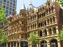 The Rialto, Winfield and Olderfleet building group, in Collins Street, Melbourne, is a group of five historic buildings all built within a few years of each other in 1888–1891. They are all a similar height, width and level of detail, making up one of the most notable historic streetscapes in Melbourne, and a particularly notable Victorian streetscape in the international context.[1] All the buildings were subject to preservation battles in the 1970s and early 1980s, ultimately saving the front portions of four of them, and the whole of one of them, the Rialto.