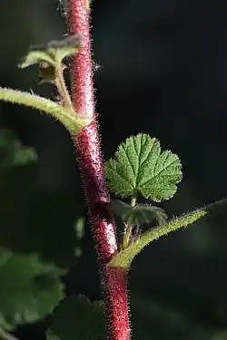 Ribes canthariforme is a chaparral shrub that reaches to 2.5 m (8.2 ft) in the shadows of large boulders and sheltered places. The stems stand erect and are covered in a fine pubescence, and lack the notable spines and prickles on the nodes and internodes of other Ribes species. Three-lobed, round, and with shallow clefts, the leaves measure 4–6 cm (1.6–2.4 in) long. The upper surface of the leaf is green, and covered in wavy, long, soft hairs, while the lower surface is a gray-green, and covered in dense hairs. The base of the leaf is cordate, and attaches to pubescent petioles 2.5–3.5 cm (0.98–1.38 in) long. The leaf margins are crenate, and have gland-tipped teeth.[6][7]