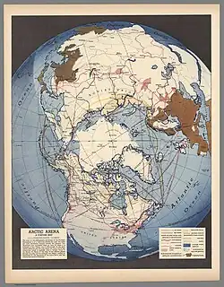 Harrison came to cartography "by chance" in 1932 when a friend asked him to momentarily replace a mapmaker working for Fortune.[4] During World War II, his cartographic visualizations became very popular. In his maps and atlases, Harrison argued for examining geographic issues from multiple perspectives and breaking from conventions, such as overuse of the Mercator projection, and always placing north at the top of the map.[5] His World representation using an azimuthal projection that was first published by Fortune in August 1941 under the title "The World Divided"[6] became highly popular and was widely copied.[7] He wanted to illustrate that "the entire conflict pivots around the U.S".[6] A latter version entitled "One World, One War" was published on Fortune in March 1942.[8] The US Army ordered 18000 copies of it.[1] It displayed United States as a pivotal element of the World War, displaying how close it was to Nazi Germany occupied territories.[7] During the war, Harrison also contributed to the Office War Information's War Atlas for Americans.[9] The design of the United Nations logo was influenced by his azimuthal projection.[7][10] His distinctive feature of the time was the usage of tilted perspective.