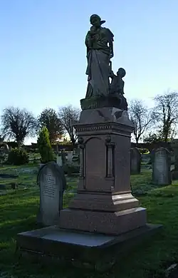 Richard Eve was taken ill in London where he had gone for the laying of a foundation stone for the Boys’ School, and died at 11 Nottingham Place in Marylebone of a seizure a few days later on 7 July 1900. He was buried in Aldershot Cemetery where a large granite memorial of the figure of Charity and a child adorns his grave.[4][9] He never married, and his estate of £34,199 6s 8d was left to fellow solicitors and the Cottage Hospital in Aldershot.[10][11]