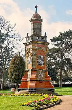 A 29 foot tall monumental drinking fountain to Eve's memory was unveiled in Brinton Park in Kidderminster in 1902. This was raised by "Admiring friends to keep his memory green in his native town which he ardently loved." The monument is faced with glazed Doulton tiles in green, terracotta and bronze and a portrait of Eve in profile.[2][13]