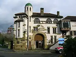Watt designed some buildings himself, but usually used four architects to execute his plans, namely Walter Aston, John Brooke, Harry S. Fairhurst, and William Longworth.[5] In 1898 Watt bought a tannery on Drury Lane, to the north of the town centre and, with Fairhurst, adapted the buildings into a laundry and cottages. One of Watt's other buildings. the King's Coffee House and Gaskell Memorial Tower, is located in the centre of the town, and a series of more eccentric houses were built between 1900 and 1907 on Legh Road, to the southeast of the town.[6] Watt lived in one of these, The Round House, until 1913.
