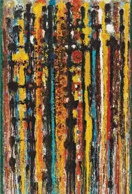 Beginning in the late 1950s, Pousette-Dart experimented with building form through small, individual dabs of color, creating paintings and works on paper that exhibit all-over, field-like compositions. By the 1960s, he concentrated on large-scale works composed of thick layers of such gestural marks, evoking pulsating, glowing allusions to space. Paintings known as Hieroglyphs, Presences and Radiances display dense fields and calligraphic structures that emerge and recede visually. Works of the 1970s and 1980s often exhibit large shapes—orbs and geometric forms— that serve as mandala-like focal points. While Pousette-Dart embraced a wide range of intense color within paintings and works on paper from the 1960s through the 1990s, he equally explored themes in black and white.
