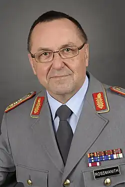 Following company command, Rossmanith attended the Command and General and Staff Officers' Course in Hamburg, from which he graduated in 1987.[1] He served in Brussels, Belgium, on his first assignment to NATO in 1987, serving as Desk Officer for Politico Military Affairs to the German Military Representative to the Military Committee. Returning to Germany, he served with Armoured Brigade 6, stationed in Hofgeismar, Hesse, in 1989, before being appointed Chief of Staff for 4 Panzergrenadier Division, based in Erfurt, Thuringia.[1]
