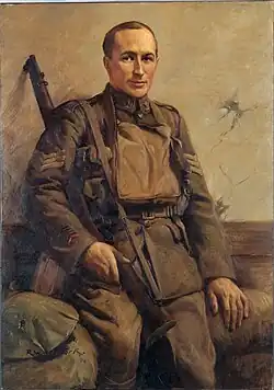 After this the 2nd Battalion moved to Flanders to hold the line during winter.[12] Throughout the remainder of 1916 he progressed through the ranks, soon reaching the rank of sergeant, whereupon he was given responsibility for a sniper and reconnaissance section consisting of hand picked men, tasked with conducting reconnaissance of German lines and capturing prisoners to gain intelligence.[2][12][22] His section quickly grew a reputation for being able to provide important intelligence on the strength and positions of the enemy.[23] As a leader he was said to have a casual approach towards things such as dress and military protocol, however, he was resourceful, had a well-developed understanding of enemy courses of action and had a penchant for detailed planning.[2]