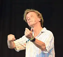 He co-wrote and performed in The Paul Merton Show at the London Palladium in 1994.[11] With Pippa the Ripper he is half of the hula-hoop/science double act Dr Hula.[12] In 2006, he appeared at the Ars Nova theatre, New York and co-founded the improv storytelling group The YarnBards. In 2012, with others he co-wrote and appeared in the UK tour and West End run of the stage show Paul Merton Out of My Head.[13]