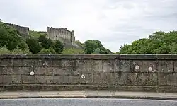 At Bow Bridge between Askrigg and Bainbridge, the existing 13th century bridge over Grange Beck was widened to accommodate the new road. The bridge is now a scheduled monument, and was replaced in 1899 with a new bridge 98 feet (30 m) to the south.[13] A bridge was constructed at Richmond which spanned the River Swale. Over this, the turnpike went in a rough south westerly direction encountering its first tollbar at Slee Hill where the edge of Richmond was. The bridge at Richmond, always known as Green Bridge as it connected Richmond Green with the south side of the Swale, which until that point, had not existed as a crossing and in fact was the only crossing of the Swale in Richmond until the bridge connecting to the railway station was opened in 1876.[14] Flooding had damaged the original bridge so much by the mid 1780s that it had to be replaced. The design of the bridge was down to John Carr of York, but as the River Swale was the dividing line between the Borough of Richmond and the North Riding of Yorkshire, each employed their own contractor to finish their half of the bridge and meet in the middle.[15][16] This can be seen in the slight differences of construction; at the county end (the southern half) the masonry is composed of two layers of stone. On the borough half (the northern end) the depth of the stone runs to three layers.[15]