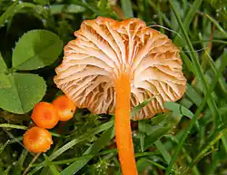 The fruit body is orange to yellow and occurs among moss, which is why it is sometimes called moss sentinel.[2] The cap is quite small, with a diameter usually less than 1 centimetre (3⁄8 in).[3] The stipe is relatively long,[2] about 1.5–4.5 cm (5⁄8–1+3⁄4 in).[4] It has little odor or taste, and is regarded as nonpoisonous.[5] The spore print is white.[4]