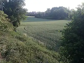 The proximity of the Meuse has caused headward erosion, so the Rida valley, like the adjacent valleys between Liège and Haccourt, cuts into the edge of the plateau of dry Hesbaye and then deepens significantly into the Meuse's side, forming terraces in the shape of a ravine leading to Herstal.[1]