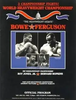 Riddick Bowe vs. Jesse Ferguson, billed as The Heavyweight Debate, was a professional boxing match contested on May 22, 1993, for the WBA and Lineal Heavyweight championships.[1] The fight took place in RFK Stadium in Washington, DC, was Bowe's second defense of the title he had won from Evander Holyfield in November 1992, and was the main event of a card that included a fight between Roy Jones Jr. and Bernard Hopkins for the vacant IBF middleweight championship, which Jones won.