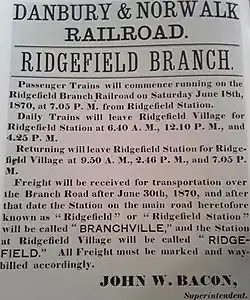 - ^ Benjamin, Scott (December 26, 2016). "Historic Ridgefield train station incorporated into supply company's overhaul". newstimes.com. Danbury News-Times. Retrieved September 12, 2022.