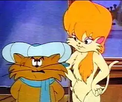 Cleo is Riff-Raff's girlfriend, who lives in a music store. She is a cream-colored cat with long blonde hair. Her fur resembles a leotard and she wears a pair of pink legwarmers. In the flashback episode "Christmas Memories", it is revealed that Cleo is, in fact, one of the Catillac Cats herself, even going as far as to indicate that she coined the name.[3] On more than one occasion, Riff-Raff ends up "two-timing" Cleo with another female cat (accidentally or otherwise).[4]