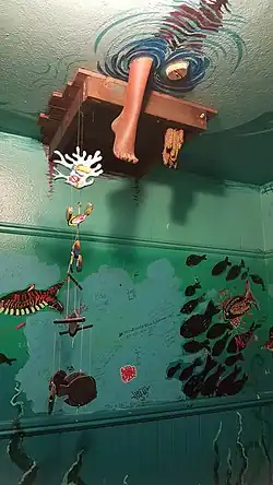According to the owner, each table is named after a different composer and has a "pseudo elegant" decor.[1][14] Some of the tables are "haunted" (animated), at times rotating or vibrating; one rises 18 inches (46 cm) every 45 minutes, returning to its original position after moving through a succession of different heights.[4][8][14] The table named for Sergei Rachmaninoff shakes when a button in the kitchen is pressed, and the Stephen Sondheim table disappears completely through a slit in the wall.[14] Couches are also available for lounging.[6] The upstairs unisex bathroom has an "under-the-sea" theme and reportedly "regularly induces screams".[8][14]