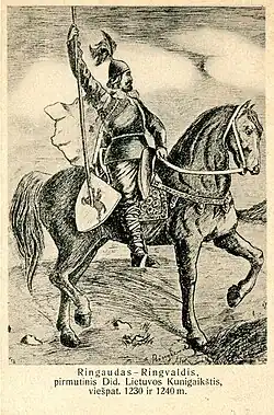 Ringaudas, son of otherwise unknown Algimantas,[1] is first mentioned in the second redaction of the Lithuanian Chronicle written c. 1515 and has no historical basis.[2] In the chronicle Ringaudas returned to Navahrudak after a victorious battle with the Mongols on the bank of the Neman River at Mohilna near Minsk.[1] This battle could have some historical basis as Mongols did invade Lithuania, but it happened in the late 1230s and early 1240s. However, it is known for a fact that at the time Mindaugas already had supreme power in Lithuania.[3] The legendary account claimed that Ringaudas fathered three sons. He left Navharudak to one of his sons, Vaišvilkas.[2] However, it is known from reliable contemporary sources that Vaišvilkas was son of Mindaugas. Therefore the third redaction of the Lithuanian Chronicle, also known as the Bychowiec Chronicle, made Ringaudas father of Mindaugas to correct this clear contradiction.[2] This legendary version was popularized by Maciej Stryjkowski and other medieval historians,[2] and it still survives to this day.[4]