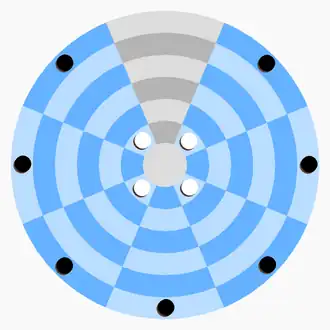 The circular gameboard consists of six concentric rings divided into eight radial segments, and a central citadel, for a total of 49 spaces of alternating light and dark colors. One radial segment has spaces specially colored to identify it as the neutral zone. The player who is the attacker initially controls seven pieces (black or dark color) that start one per space on the outermost ring (but not in the neutral zone). The player who is the defender initially controls four pieces (white or light color) that start on the four light-colored spaces of the innermost ring (also not in the neutral zone). The attacker wins by occupying the citadel with two of their pieces. The defender wins by capturing six attacker pieces,[3] or by blocking all attacker pieces from moving.[2] (Thus rendering an attacker win impossible.)