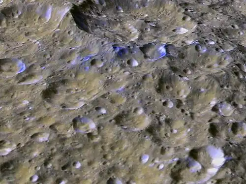 In November 2005 the Cassini orbiter found that Saturn's magnetosphere is depleted of energetic electrons near Rhea.[3] According to the discovery team, the pattern of depletion is best explained by assuming the electrons are absorbed by solid material in the form of an equatorial disk of particles perhaps several decimeters to approximately a meter in diameter and that contains several denser rings or arcs. Subsequent targeted optical searches of the putative ring plane from several angles by Cassini's narrow-angle camera failed to find any evidence of the expected ring material, and in August 2010 it was announced that Rhea was unlikely to have rings,[4] and that the reason for the depletion pattern, which is unique to Rhea, is unknown.[5][6] However, an equatorial chain of bluish marks on the Rhean surface suggests past impacts of deorbiting ring material and leaves the question unresolved.[7]