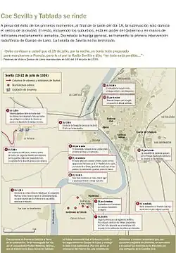 In Castilleja de la Cuesta a car passed by the column without being disturbed. In it were two Falangists, who went to the center of Seville and joined the rebels.[5] At 10:00, the commander-in-chief of the nationalist forces in Andalusia ordered the civil guards, who had arrived from Huelva the night before, to intercept the column.[9]