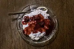 In Sweden, this dish is called ris à la Malta.[9] Typically it is made of chilled leftover rice pudding, whipped cream, sugar and vanilla, with or without almonds. By tradition, the person finding a hidden almond in the dessert is expected to get married before the next Christmas. A variety containing diced oranges is called apelsinris. The dish is mostly served with either a smooth cordial, jam or semi-thawed frozen berries.