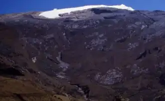 Ritacuba Blanco is the highest peak of Cordillera Oriental, in the Andes Mountains of Colombia. It's also named Ritak'uwa, an ancient name from the U'wa indigenous people that live in the lowlands of the National Park Sierra Nevada del Cocuy y Güicán, where the Ritacuba Blanco is located. The summit is accessible from the west via the town of El Cocuy, the village of Güicán, and the hamlet of Las Cabañas. The hike is fairly easy, but the weather is not reliable, and a glacier must be crossed. Because of global warming, its glacier is melting at very high rates, backing down 25 linear mts per year; the same is happening at amazing speeds to all other snow-covered tropical mountains in Colombia. In 1950, Ritacuba Blanco's glacier extended down to 4,100 metres (13,500 ft) above sea level; in January 2007 its lowest point was at 4,500 metres (14,800 ft) above sea level. If this melting rate continues, the glacier is expected to disappear before 2055.