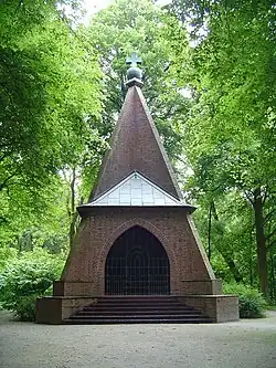 On February 21, 1932, the former mayor Grube inaugurated a war memorial in the park of Ritzebüttel Castle. It was designed by the then-city architect Carl Jung and commemorates those who fell during the First World War. The memorial is located on the grounds of the Krähenhof, which burned down in 1909 and was added to the castle garden area in 1913. Architecturally, it resembles the Kugelbake (a maritime navigational structure). The last structural modifications were made in 1980, when the original sandstone honor plaques inside the memorial were replaced with metal ones, and an iron grille was installed.