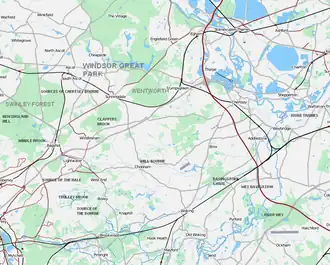 The Windle Brook is a small river springing at New England Hill, Swinley Forest, Berkshire a forest with some military use in the Crown Estate with further nearby sources in Bagshot, Surrey. Brooks of Windlesham merge with the Windle Brook below Windlesham Golf Club then flow through Windlesham Arboretum, a public space managed by Surrey Wildlife Trust.[3] The brook runs north of Chobham and through Windlesham, providing the latter with its name. During this journey a few lakes are made, including Rapley Lake and just below a private lake with weir in royal Bagshot Park.[2]