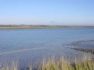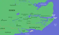 Wallasea Island was created from five smaller islands by building sea defences, and was largely used for grazing sheep until the 1930s, when it was drained to provide arable land.[19] In 2006, the Department for Environment, Food and Rural Affairs (DEFRA) created 284 acres (115 ha) of new saltmarsh and intertidal mud flats.[20] Since 2008, a project managed by the Royal Society for the Protection of Birds (RSPB) to transform more of the island back to intertidal coastal marshland has been ongoing, helped by spoil from the excavation of tunnels for the Crossrail project, which has been used to raise the level of parts of the island. Breaches were then made in the sea walls, to create some 1,500 acres (610 ha) of intertidal habitat.[19] In order to deliver over 3 million tonnes of earth, Crossrail built a temporary jetty in the river, where ships arrived between August 2012 and March 2015, and the sea walls were breached on 11 July 2015. The original plans involved a further 8 million tonnes of soil, but the RSPB were unable to source this, and so a revised scheme was implemented, where sea water was admitted to shallow lagoons through an existing sluice in the sea wall.[21] The river continues eastwards, and is joined by the River Roach at the eastern end of Wallsea Island.[4] It flows into the North Sea between Holliwell Point (grid reference TR026963) and Foulness Point (TR048954) on its north and south banks respectively.[22] High water at Burnham is one hour and ten minutes later than high water at Dover, with a tidal range of 16 feet (5 m) at spring tides and 10 feet (3.2 m) at neap tides.[10] Approaching the river from the North Sea requires care, as the Whitaker Channel and Ray Sand Channel are separated by a large sandbank known as Buxey Sand, and to the south of the Whitaker Channel, the Foulness Sands are a danger area, used as a military firing range.[4]