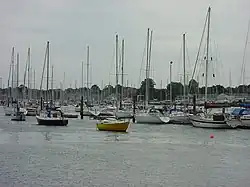 A passenger ferry crosses the river between Hamble-le-Rice and Warsash, forming a link for the Solent Way and E9 European Coastal Path. This section of the river is dominated by a number of marinas, the largest being the Port Hamble Marina, and boat yards on both banks as far upstream as Bursledon.[3] On the east bank, south of Warsash, is the Warsash Maritime School, part of Solent University, which provides training for merchant navy crew.