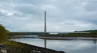 The River Suir Bridge is a cable-stayed bridge over the River Suir in Ireland. It was built as part of the N25 Waterford Bypass,[2] and opened to traffic on 19 October 2009, some ten months ahead of schedule.[3] The Viking settlement at Woodstown was discovered during the project and the route of the southern approach roads was altered to preserve the site.