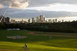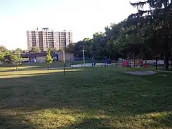 There are three medium to large sized parks in Riverdale. At the west edge between Broadview Avenue and the Don Valley Parkway just north of Bridgepoint Health is Riverdale Park. This park features a running track, three baseball diamonds, a skating rink, a public swimming pool and tennis courts. Just to the east of Riverdale Park is Withrow Park which has a large off-leash dog area, an ice rink, two baseball diamonds, play structures, and a soccer field. In South Riverdale is Jimmie Simpson Park which contains tennis courts and a community centre. In the southwest corner just north of Queen St. East on Broadview Avenue is the Royal Canadian Curling Club. The curling club features six sheets and hosts leagues for about 500 members. The last park in Riverdale located further east along Blake Street is Kempton Howard Park (formerly East View Park) and was renamed in 2007 in honour of a youth worker who was killed in 2003 in the Blake/Boultbee community in which he lived and worked. Hubbard Park located next to Riverdale Library is named for William Peyton Hubbard.[16]