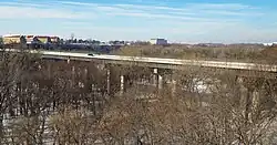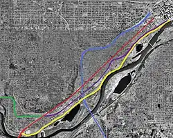 Every route requires crossing the Mississippi River from Saint Paul to Fort Snelling. The current Fort Road Bridge was built in 1960 by the Minnesota Department of Transportation and was designed by Sverdrup & Parcel Engineering Company. It is the third bridge on the site, the first bridge, a deck girder bridge was built in 1880. The second bridge, a metal arch bridge was built by 1912. While almost all of the proposed routes would use the Fort Road Bridge, one suggested using a rail spur north and using the Ford Parkway Bridge upstream. Both routes would have had potential problems with the adaptation of the current bridge. When using the Fort Road Bridge, it was unknown if it could handle light rail or if a tunnel on the Fort Snelling side of the bridge could be widened. If the Ford Parkway bridge was used there were additional concern with the alignment of the route to the bridge.[15] The second bridge at the Fort Road site and the Ford Parkway Bridge had held streetcar traffic.[16]