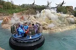 Guests begin by boarding rafts and set off upriver to Field Camp Beta. However, a fallen tree blocks the way and diverts the current in another direction, into the mountain. The ride has guests pass by a massive Audio-Animatronic of Q’aráq, who snaps at the guests as they travel through his subterranean lair.[2] After escaping Q’aráq, the rafts enter a whirlpool, then past simulated volcanic vents and steaming geysers as the rapids sweep guests to the end of the ride.[1]