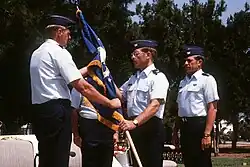 This article incorporates text from this source, which is in the public domain.MG Thomas A. Baker, left, commander, 16th Air Force, passes the unit colors of the 7276th Air Base Group to COL Robert A. Hoffmann. Series: Combined Military Service Digital Photographic Files, 1921 - 2008. National Archives at College Park. June 30, 1987. Retrieved December 30, 2018.