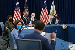 On March 18, President Joe Biden ordered all U.S. flags at the White House, on other federal grounds, at military installations, on naval vessels, and at U.S. diplomatic missions to be flown at half-mast until sunset on March 22 to respect the victims of the shooting.[72][73] He and Vice President Kamala Harris subsequently met with local Asian American community leaders on March 19 to discuss the shootings.[72][74] After the meeting, he gave a speech condemning rising hate crimes against Asian Americans during the COVID-19 pandemic and declared his support for the proposed COVID-19 Hate Crimes Act, which he claimed would facilitate tackling anti-Asian hate crimes.[74]