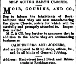 Cousins & Moir built the Rockhampton Girls Grammar School in 1890, along with the Rockhampton Supreme Court Hotel and the Mount Morgan Receiving Stores.[1][4] They also built the Kenmore Mansion in Ward Street which was completed in 1894.[6]