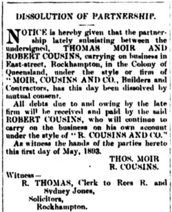 In 1893, Cousins and Moir mutually agreed to dissolve the partnership with Cousins continuing on the business as R. Cousins & Co. Moir continued his own career and built such landmarks as the Lakes Creek Hotel and the Emerald Railway Station.[7][8]