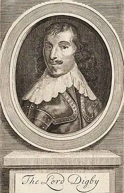 Digby was the son of Sir Robert Digby of Coleshill, Warwickshire, and Lettice FitzGerald, of Geashill, Ireland, granddaughter of Gerald FitzGerald, 11th Earl of Kildare.[1] John Digby, 1st Earl of Bristol, was his uncle, and Essex Digby, Bishop of Dromore, his brother. Digby notably served as Governor of King's County in Ireland. In 1620, he was raised to the Peerage of Ireland as Baron Digby, of Geashill. He married, firstly, Lady Sarah Boyle, daughter of Richard Boyle, 1st Earl of Cork, and Catherine Fenton; this marriage produced a son, Kildare Digby (c. 1627 – 1661).[1] Digby married secondly, Elizabeth Altham, daughter of Sir James Altham and his second wife, Mary Stapers. Digby died in 1642 and was succeeded in the barony by his son Kildare.[1] They are buried in the parish church of St Peter and St Paul, Coleshill.[2]