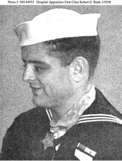 Bush joined the United States Naval Reserve (United States Navy Reserve) at age 17 on January 5, 1944, as an apprentice seaman, Class V-6, at Navy Recruiting Station, Seattle, Washington.[2] After completing recruit training at the Farragut Naval Training Station, at Farragut, Idaho, he was sent to and graduated from the Naval Hospital Corps Schools in Farragut.[2] He was assigned to the Naval Hospital, Seattle, before completing further training at the Field Medical Service School, Fleet Marine Force Training Center, Camp Pendleton, California.[3] During his training, he was advanced to seaman second class then to hospital apprentice second class. On March 1, he was temporarily advanced to hospital apprentice first class.