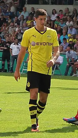 Lewandowski ended the 2013–14 season as the top goalscorer in the Bundesliga with 20 goals, which earned him the Torjägerkanone.[54] He also scored six goals in the Champions League, as Dortmund reached the quarter-finals.[55] During the second leg of the round of 16 match between Borussia Dortmund and Zenit, Lewandowski received a second yellow card, which resulted in his suspension for the first leg of the quarter-final against Real Madrid.