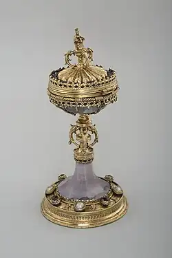 Mangot's hallmark appears on the silver-gilt mount of a book belonging to Trinity College, Cambridge, which seems to be depicted in the portrait of Thomas Cromwell by Hans Holbein the younger,[15][16][17] and on a jewelled cup known as "Le baguier de Pierre Mangot".[18] Mangot's use of a hallmark depicting a crowned "M" was identified by a Louvre curator, Michèle Bimbenet-Privat.[19]
