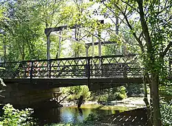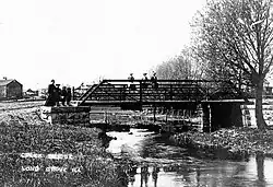 A Protestant church and cemetery, was founded in 1846. A wooden bridge was built over Buffalo Creek in the late 1800s to connect a commerce district with the Protestant church.[4] By the end of the nineteenth century, the expansion of the crossroads on the other side (becoming home to multiple businesses and a town hall) and the rise of the automobile introduced the need for a new, sturdier bridge. In response, the bridge that exists today was built in 1906 by the Joliet Bridge and Iron Company,[2]: 7,8 [4] and it became known as the Buffalo Creek Bridge.[8]