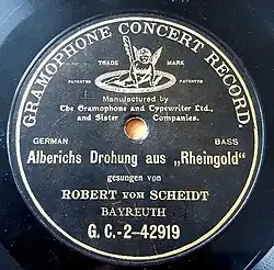 Vom Scheidt left records for G&T (Bayreuth 1904), Gramophone (Berlin 1909), Homokord (Berlin 1909), Anker (Berlin 1909), Odeon (Berlin 1909), Polyphon (Leipzig 1910) and Pathé (Berlin 1911-12).