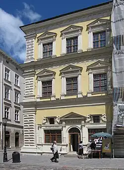 While in Kraków, he engaged in commercial manipulations and shady trade agreements with local merchants in the textile market, which brought him incredibly large profits, but also resulted in numerous litigations.[2] Within a few years he had moved to Lwów (now Lviv, Ukraine). On 4 March 1629 Bandinelli obtained a royal license from Sigismund III Vasa to run two postal services from Lwów: one, to what is now Gdańsk through Zamotja (Zamość), Lublin, Warsaw and Toruń; and another, to Kraków, through Jarosław, Rjashiv and Tarnów. Each of the services was weekly, with the mail leaving every Saturday. The post office was housed in Bandinelli's home, a kamienica on Lviv Market Square that is now known as the Bandinelli Palace (pictured). In later years he expanded his deliveries to include the entire territory of Ruthenia.[2][3]