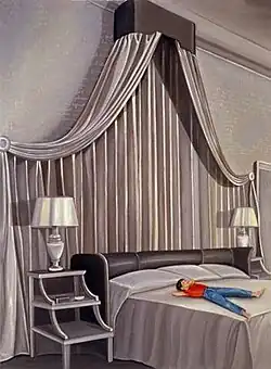 Tewes's environments became increasingly refined in the 1990s through the influence of Japanese art and minimalists like Agnes Martin. Less figurative, with pristine, 1950s-like interiors, they were painted in a deadpan style recalling Magritte. ARTnews critic Barbara Pollack described them as "pretty as bonbons, potent as cherry bombs" and Roberta Smith of The New York Times noted their sense of color and detail.[9][27][28] Nonetheless, critics observed that these intimately scaled, frozen moments also conveyed a stifling hermeticism in which "domesticity becomes terrifying."[29][30] Details such as empty chairs, rugs resembling black holes, empty mirrors, switched-on lights, smoking cigarettes, and strewn toys in vacant rooms conveyed a sense of absence, silence, or speechlessness in the lives of unseen inhabitants.