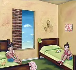 In other paintings, Tewes decorated rooms with Rorschach-style marks or camouflage, that critics like Artforum's Ingrid Schaffner suggested were metaphors for the home as a screen for projecting primal emotions[29][32] or "a demilitarized zone" littered with land mines of secrets, lies, and broken promises.[9] Schaffner glimpsed signs of escape through "imaginative enterprise" in Tewes's depictions of children absorbed in drawing or shadow puppets, contra their surroundings,[29] however others like the Los Angeles Times' William Wilson saw in the work a wry, but dispiriting commentary on bourgeois existence.[5]